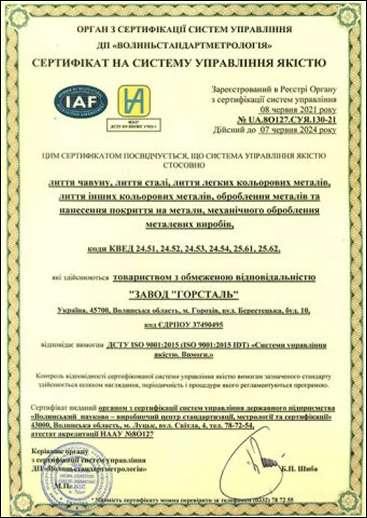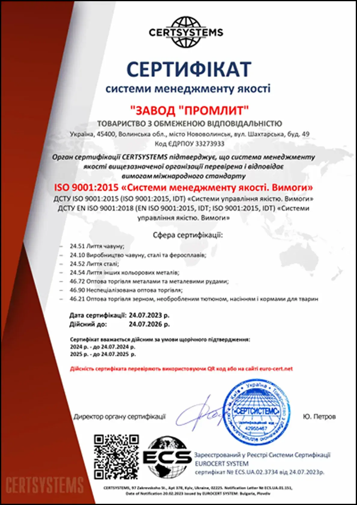 Наявність сертифікатів якості та дотримання європейських і міжнародних стандартів — це не просто формальність, а реальний інструмент гарантування безпеки, стабільності та довіри до продукції Західної ливарної групи. Ми розуміємо, що саме якість є основою успішного та довгострокового співробітництва з нашими партнерами.